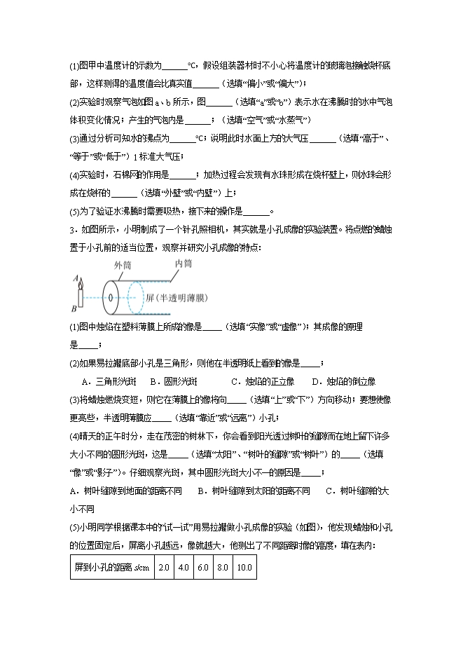 【内容简介】1.用如图甲所示的装置“探究某物质熔化的特点” (1)组装器材时,应先固定 (填“A”“B”或“C”);为了缩短加热时间,烧杯中的水应加到 为止。(2)下列措施不能使物质受热均匀的是________。A.加热过程中不断搅拌 B.通过水给试管加热 C.试管中的药品用大块固体(3)加热到某一时刻温度计示数如图乙所示,其温度为 ℃。(4)根据实验数据绘出该物质的温度一时间图像如图丙所示,该物质是 ,BC段物质的状态是 。(5)另一小组同学用相同物质进行实验,绘制出的温度一时间图像中没有出现明显的水平段,原因可能是 (写出一种即可)。2.在探究“水的沸腾”实验中,实验装置如图甲所示。当水温上升到图甲温度计所示的温度时,每隔1min记录一次温度计的示数,得到如下数据:时间/min 0 1 2 3 4 5 6 7 8 9温度 96 99 101 102 102 102 102 102 102(1)图甲中温度计的示数为 ℃,假设组装器材时不小心将温度计的玻璃泡接触烧杯底部,这样测得的温度值会比真实值 (选填“偏小”或“偏大”);(2)实验时观察气泡如图a、b所示,图 (选填“a”或“b”)表示水在沸腾时的水中气泡体积变化情况;产生的气泡内是 ;(选填“空气”或“水蒸气”)(3)通过分析可知水的沸点为 ℃;说明此时水面上方的大气压 (选填“高于”、“等于”或“低于”)1标准大气压;(4)实验时,石棉网的作用是 ;加热过程会发现有水珠形成在烧杯壁上,则水珠会形成在烧杯的 (选填“外壁”或“内壁”)上;(5)为了验证水沸腾时需要吸热,接下来的操作是 。3.如图所示,小明制成了一个针孔照相机,其实就是小孔成像的实验装置。将点燃的蜡烛置于小孔前的适当位置,观察并研究小孔成像的特点: (1)图中烛焰在塑料薄膜上所成的像是 (选填“实像”或“虚像”);其成像的原理是 ;(2)如果易拉罐底部小孔是三角形,则他在半透明纸上看到的像是 ;A.三角形光斑 B.圆形光斑 C.烛焰的正立像 D.烛焰的倒立像(3)将蜡烛燃烧变短,则它在薄膜上的像将向 (选填“上”或“下”)方向移动;要想使像更亮些,半透明薄膜应 (选填“靠近”或“远离”)小孔;(4)晴天的正午时分,走在茂密的树林下,你会看到阳光透过树叶的缝隙而在地上留下许多大小不同的圆形光斑,这是 (选填“太阳”、“树叶的缝隙”或“树叶”)的 (选填“像”或“影子”)。仔细观察光斑,其中圆形光斑大小不一的原因是 ;A.树叶缝隙到地面的距离不同 B.树叶缝隙到太阳的距离不同 C.树叶缝隙的大小不同(5)小明同学根据课本中的“试一试”用易拉罐做小孔成像的实验(如图),他发现蜡烛和小孔的位置固定后,屏离小孔越远,像就越大,他测出了不同距离时像的高度,填在表内: