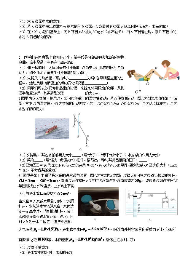 【内容简介】1.在上周的自主复习中物理课代表建议大家“回归课本”,如图是课本上的原图,针对图中情境增加条件拓展科学思维:小强用100N的力斜向上拉着总重为500N的小车使小车在水平路面上匀速前进了10m用了10s。下列说法中正确的是( )A.这一过程中地面对小车的摩擦力一定是100NB.这一过程中100N的拉力对小车做的功一定是1000JC.这一过程中小车的速度为1m/sD.这一过程中小车对地面的压力一定等于500N2.如图所示,杠杆OBA可绕O点在竖直平面内转动, ,在B点悬挂一个10N的重物G,在A点施加竖直向上的动力 使杠杆OBA水平平衡(杠杆重力及摩擦均忽略不计),下列说法正确的是( )A.在A点施加竖直向上的力 时,该杠杆是费力杠杆B.作用在A点的力 的大小为5NC.如果重物的悬挂点B向O点移动,要使杠杆水平平衡, 应变小D.若将作用于A点的力 变为图中 ,要使杠杆水平平衡, 应小于 3.. 轻质杠杆AOB悬挂于天花板上,AO=6dm,AC=1dm,OD=3dm,DB=4dm。在C点处悬挂一个重为30N的物体,如图所示。为使杠杆在图示位置平衡,施加的最小力为( )A. 37.5N B. 30N C. 25N D. 20N4.小明有一件重约15N的工艺品,用细线悬挂两端点A、B处于静止状态,如图甲所示。他想用平衡的知识,通过计算在A、B连线上找出O点的位置,以便用一根细线系在O点将工艺品悬挂起来,静止时如图乙所示,并计算出工艺品的重力。小明身边只有一把弹簧测力计(0~10N)、一把刻度尺和若干细线,他设计了如下实验,请完成以下实验步骤: