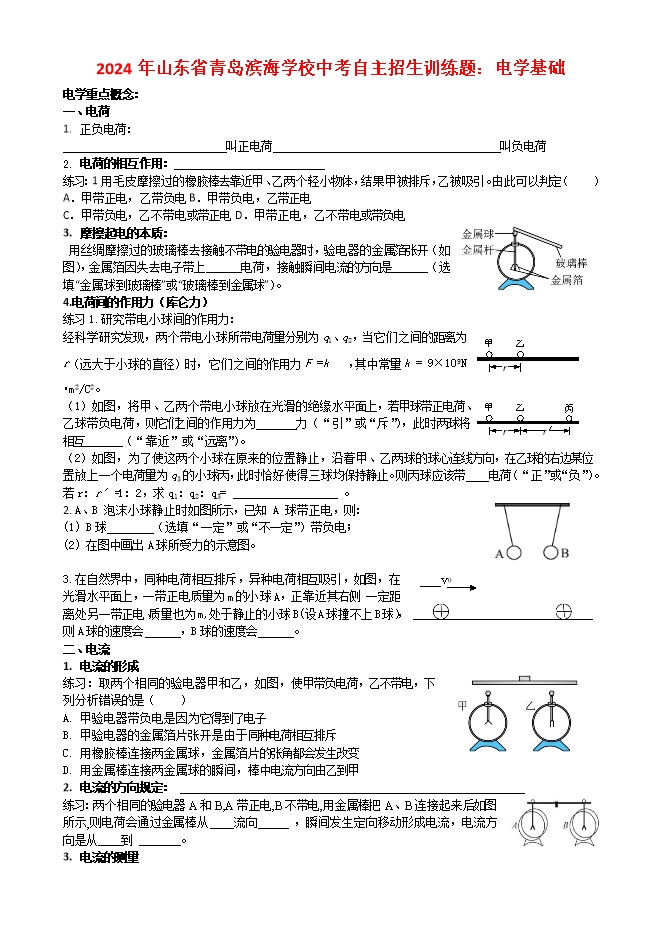 【内容简介】一、电荷1. 正负电荷: 叫正电荷 叫负电荷2. 电荷的相互作用: 练习:1用毛皮摩擦过的橡胶棒去靠近甲、乙两个轻小物体,结果甲被排斥,乙被吸引。由此可以判定( )A.甲带正电,乙带负电B.甲带负电,乙带正电C.甲带负电,乙不带电或带正电D.甲带正电,乙不带电或带负电3. 摩擦起电的本质: 用丝绸摩擦过的玻璃棒去接触不带电的验电器时,验电器的金属箔张开(如图),金属箔因失去电子带上______电荷,接触瞬间电流的方向是______(选填“金属球到玻璃棒”或“玻璃棒到金属球”)。4.电荷间的作用力(库仑力)练习1.研究带电小球间的作用力:经科学研究发现,两个带电小球所带电荷量分别为q1、q2,当它们之间的距离为r(远大于小球的直径)时,它们之间的作用力F =kq1q2r2,其中常量k = 9×109N•m2/C2。(1)如图,将甲、乙两个带电小球放在光滑的绝缘水平面上,若甲球带正电荷、乙球带负电荷,则它们之间的作用力为 力(“引”或“斥”),此时两球将相互 (“靠近”或“远离”)。(2)如图,为了使这两个小球在原来的位置静止,沿着甲、乙两球的球心连线方向,在乙球的右边某位置放上一个电荷量为q3的小球丙,此时恰好使得三球均保持静止。则丙球应该带 电荷(“正”或“负”)。若r:r′=1:2,求q1:q2:q3= 。