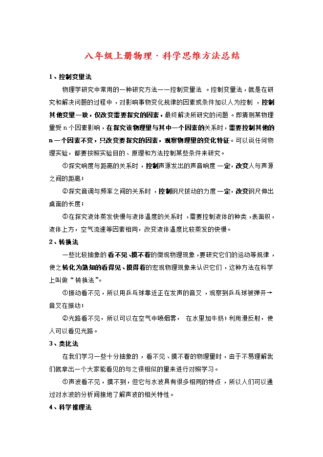 【内容简介】1、控制变量法物理学研究中常用的一种研究方法一一控制变量法。控制变量法,就是在研究和解决问题的过程中,对影响事物变化规律的因素或条件加以人为控制,控制其他变量一致,仅改变需要探究的因素,最终解决所研究的问题。即猜测某物理量受n个因素影响,在探究该物理量与其中一个因素的关系时,需要控制其他的n一个因素不变,只改变要探究的因素,观察物理量的变化特征。可以说任何物理实验,都要按照实验目的、原理和方法控制某些条件来研究。①探究响度与距离的关系时,控制声源发出的声音响度一定,改变人与声源之间的距离;②探究音调与频率之间的关系时,控制钢尺拨动的力度一定,改变钢尺伸出桌面的长度;③在探究液体蒸发快慢与液体温度的关系时,需要控制液体的种类,表面积,液体上方,空气流速等因素相同,改变液体温度比较蒸发的快慢。2、转换法一些比较抽象的看不见、摸不着的微观物理现象,要研究它们的运动等规律,使之转化为熟知的看得见、摸得着的宏观物理现象来认识它们,这种方法在科学上叫做“转换法”。①振动看不见,所以用乒乓球靠近正在发声的音叉,观察到乒乓球被弹开→音叉在振动;②光路看不见,所以可以在空气中喷烟雾,在水里加牛奶;利用漫反射,使人可以看见光路。