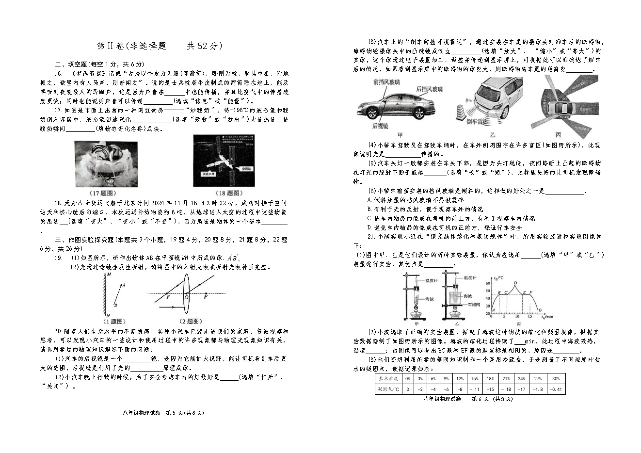 【内容简介】一、选择题(本题包括15小题,共48分。在每小题给出的四个选项中,第1~12 小题只有一项符合题目要求,选对得3分;第13~15小题,有多项符合题目要求,全部选对得4分,选对但不全的得2分,有选错的得0分。)1.估测是物理学习中常用的方法,下列估测的数据中,最接近实际的是A.初中物理课本的宽度约为18cmB.一个排球的质量大约是1kgC.人感觉较舒适的温度约为35℃D.升国旗演奏一遍中华人民共和国国歌的时间大约是120s2.在第十九届亚洲运动会的田径赛场上,为铁饼运动员运输铁饼的四足机器人引人注目,这也是全球赛事上第一次使用四足机器人。如图所示为机器人背着铁饼在赛场上奔跑的情境,下列说法中正确的是A.以机器人为参照物,铁饼是运动的B.以地面为参照物,机器人是静止的C.以机器人为参照物,铁饼是静止的D.以地面为参照物,铁饼是静止的3.如图所示,在鼓面上撒些纸屑,用鼓槌敲击鼓面使鼓面发声时,发现鼓面上的纸屑跳动起来。用手按住鼓面不让鼓面发声时,发现纸面上的纸屑也停止跳动。这个实验可以说明A.声音的传播需要介质 B.发声的物体在振动C.声音的响度跟振幅有关 D.音调跟振动的频率有关4.小滨在研究声音的特性时,做了以下实验:如甲图,他将一块平面镜固定在水平鼓面上,用固定位置的激光笔照射平面镜,墙壁上出现一个小光斑;乙图为小滨用吸管自制的“管乐器”。以下说法中正确的是 A.他从多个角度都能观察到墙上的小光斑,说明了光在墙壁上发生了镜面反射B.敲击鼓面墙上光斑跳动,加大敲击力度光斑跳动幅度更大说明振幅越大响度越大C 轻压图中平面镜右侧的鼓面,墙壁上光斑位置将上移D.小滨吹奏“管乐器”时,吸管越长音调越高,吸管越短音调越低5.在一些洗手间装有热风干手器,将手张开用它可以很快把手烘干,如图所示.关于图中利用了哪几种方法加快水的蒸发,以下选项中正确、全面的是①提高液体的温度 ②增大液体的表面积 ③加快液体表面空气流动速度A. ①②