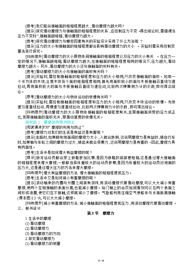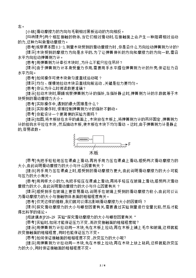 【内容简介】一、新课导入拔河比赛时,一般都会选择那些体重较大的同学参加比赛,且要求这些同学穿上新的运动鞋,你知道其中的原因吗? 二、教学步骤探究点1 摩擦力[阅读课本]P27~28“摩擦力”[思考]观察课本图8.3⁃2,你能找出产生摩擦的两个物体吗?[提示]木块在凹凸不平的桌面上运动产生了摩擦力。[归纳提升]产生摩擦的两个物体都是相互接触的。[思考]用橡皮擦去书上的字会有什么样的感受?[提示]感觉到书阻碍橡皮向前运动。可以用手代替橡皮,用课桌代替书,这样感受更加直接。[思考]用毛刷在黑板上滑动,观察摩擦力的方向有什么特点?[提示]当毛刷向上运动时,毛刷的毛形变方向向下;当毛刷向左运动时,毛刷的毛形变方向向右。[小结]滑动摩擦力的方向与毛刷相对黑板运动的方向相反。[归纳提升]两个相互接触的物体,当它们相对滑动时,在接触面上会产生一种阻碍相对运动的力,这种力叫做滑动摩擦力。[思考]观察课本图8.3⁃3,测量木块受到的滑动摩擦力时,你是沿什么方向拉动弹簧测力计的?[提示]木块受到的摩擦力方向是水平的,为了让弹簧伸长的方向和摩擦力的方向一致,需沿水平方向拉动弹簧测力计。[思考]用弹簧测力计牵引木块时,为什么不能只拉住吊环?[提示]由于弹簧测力计本身受重力作用,需要用手水平握住弹簧测力计的外壳,保证拉力沿水平方向。[思考]如何操作可使木块做匀速直线运动呢?[提示]均匀、缓慢地拉动木块沿直线向前运动,关键是拉力要均匀。[思考]你认为什么时候读数更准确?[提示]拉动木块时,眼睛观察弹簧测力计的指针,当指针静止时,弹簧测力计的示数就等于木块受到的滑动摩擦力大小。[思考]实际操作中,遇到的最大困难是什么?[提示]实际操作时,很难控制弹簧测力计的指针不颤动。[思考]你能设计一个更简便的实验方案吗?[提示]如图,将木板放在水平的桌面上,木块放在木板上,将弹簧测力计的吊环固定,弹簧测力计的挂钩水平拉住木块,然后抽动木板,使木板在木块下均匀滑动。这时,由于弹簧测力计是静止的,容易读数。