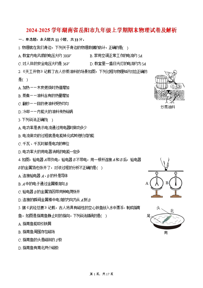 【内容简介】1.物理就在我们身边,下列关于身边的物理数据的估计,正确的是( )A. 教室内电风扇的电压大约380V B. 家用空调正常工作的电流约5AC. 对人体的安全电压大约是36V D. 教室里一盏日光灯的电流约为5A2.《天工开物》记载了古人炒蒸油料的场景如图,下列过程与物理知识对应正确的是( )A. 加热——木炭燃烧时热值增加B. 蒸煮——油料含有的热量增加C. 翻炒——目的使油料受热均匀D. 冷却——内能大的油料传热给锅3.下列说法正确的( )A. 电功率是表示电流通过用电器时做功多少B. 电流做功的过程就是电能转化成其他形式的能C. 千瓦、千瓦时都是电功的单位D. 电功率大的用电器消耗的电能一定多4.如图,验电器A带负电,验电器B不带电,用一根杆连接A和B后,验电器B的金属箔也张开了,对该过程的分析不正确的是( )A. 连接验电器A、B的杆是导体B. A中的电子通过金属棒流向BC. 验电器B的金属箔因带同种电荷张开D. 连接的瞬间金属棒中电流的方向为从A到B5.据《武经总要》记载,古人将具有磁性的空心铁鱼放入水中漂浮,制成指南鱼,如图是指南鱼静止时的指向,下列说法错误的是( )A. 指南鱼能吸引铁屑B. 指南鱼周围存在磁场C. 指南鱼的头是磁体的S极D. 指南鱼有南北两个磁极