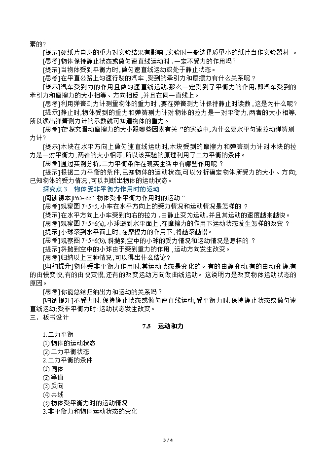 【内容简介】空中匀速下降的跳伞运动员受到竖直向下的重力作用,为什么还能做匀速直线运动?运动员在竖直方向上只受到重力的作用吗? 二、教学步骤探究点1 什么是二力平衡[阅读课本]P63“二力平衡”[思考]观察图7⁃5⁃1(a),小鸟受到几个力的作用?小鸟的运动状态是怎样的?[提示]小鸟受到支持力和重力的作用,小鸟保持静止状态。[思考]观察图7⁃5⁃1(b),处于上方的杂技演员受几个力的作用?其运动状态如何?[提示]上方的杂技演员受到支持力和重力的作用,其保持静止状态。[思考]观察图7⁃5⁃1(c),运动员和降落伞受到几个力的作用?其运动状态如何?[提示]运动员和降落伞受到重力和空气阻力的作用,运动员和降落伞做匀速直线运动。[思考]物体不受力作用时,它的运动状态保持不变,物体受到了力,运动状态为什么还能保持不变呢?[提示]由于物体所受两个力的作用效果相互抵消,所以保持静止状态或做匀速直线运动。[归纳提升]若一个物体在两个力的作用下,保持静止状态或做匀速直线运动,我们就说这两个力互相平衡,或者说物体处于二力平衡状态。探究点2 二力平衡的条件[阅读课本]P63~65“二力平衡的条件”[思考]观察图7⁃5⁃2,分析桌面上的小车的受力情况。[提示]竖直方向上受重力和支持力;水平方向上受两根绳的拉力。[思考]实验要探究的是哪两个力的关系?[提示]小车在水平方向上运动,探究的是小车在水平方向上的受力情况。[思考]装有支架的桌面上固定的两个定滑轮有什么作用?[提示]定滑轮可以改变拉力的方向。[思考]在两端的小盘里加砝码有什么作用?[提示]改变砝码的质量可以改变砝码的重力,从而改变对小车拉力的大小。[思考]在两端小盘里添加质量不相同的砝码,小车还能静止吗?这说明了什么?[提示]当两端小盘里的砝码质量相等时,小车才能保持静止,说明二力平衡的条件之一是力的大小相等。