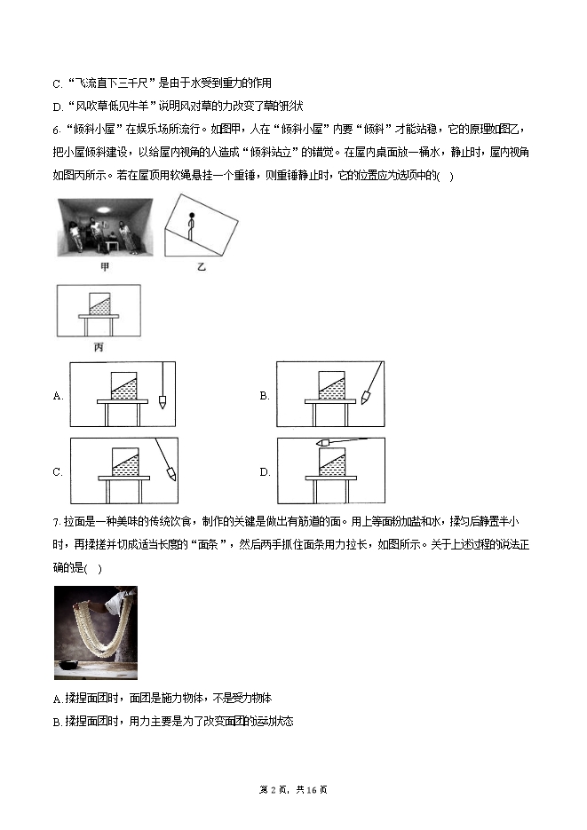 【内容简介】1.下列情景中,物体的运动状态不发生改变的是( )A. 绕地球转动的卫星 B. 向斜上方抛出的铅球C. 匀速转弯的汽车 D. 斜直线方向匀速运动的货物2.如图所示,人坐在小船上,在用力向前推另一艘小船时,人和自己坐的小船却向后移动。由上述现象,不能得出的结论是( ) A. 物体间力的作用是相互的 B. 施力物体同时又是受力物体C. 力能改变物体的运动状态 D. 力的作用效果与力的作用点有关3.有关力的说法中,错误的是( )A. 物体间力的作用一定是相互的B. 物体速度大小或运动方向发生改变,它一定受到了力的作用C. 作用在同一物体上的两个力,大小相等,方向相同,它们产生的效果一定相同D. 力既可以改变物体的运动状态,也可以改变物体的形状4.下列数据中与实际情况相符的是( )A. 一根小铁钉的重力约为10N B. 一名普通中学生的体重约为2000NC. 一个鸡蛋的重力约为0.5N D. 黑板擦受到的重力约为100N5.下列关于力的说法错误的是( )A. 成语“孤掌难鸣”说明一个物体不会产生力B. “卵与石斗,麋碎无疑”是因为鸡蛋受到的力大于石头受到的力C. “飞流直下三千尺”是由于水受到重力的作用D. “风吹草低见牛羊”说明风对草的力改变了草的形状6.“倾斜小屋”在娱乐场所流行。如图甲,人在“倾斜小屋”内要“倾斜”才能站稳,它的原理如图乙,把小屋倾斜建设,以给屋内视角的人造成“倾斜站立”的错觉。在屋内桌面放一桶水,静止时,屋内视角如图丙所示。若在屋顶用软绳悬挂一个重锤,则重锤静止时,它的位置应为选项中的( )