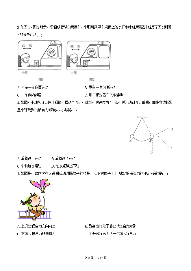 【内容简介】1.如图所示是甲乙丙三个物体在平直的水平路面上运动的s-t图象,由图象可以判断( ) A. 甲物体处于平衡状态 B. 乙物体处于平衡状态C. 丙物体处于平衡状态 D. 甲、乙、丙物体都不处于平衡状态2.氢气球下吊一重物G,在空中恰能沿MN方向做匀速直线运动,若不计空气阻力和风的影响,下图中气球和重物G在运动中所处的位置正确的是( )A. B. C. D. 3.如图1、图2所示,沿直线行驶的两辆车,小明所乘甲车桌面上的水杯和小红所乘乙车经历了图1到图2的情景,则( ) A. 乙车一定向西运动 B. 甲车一直匀速运动C. 甲车向西减速 D. 甲车相对乙车向东运动4.如图,小球从A点静止释放,摆动至B点,此刻小球速度为0。若小球运动到B点瞬间,细绳突然断裂且小球受到的所有力都消失,小球将( )A. 沿轨迹1运动 B. 沿轨迹2运动C. 沿轨迹3运动 D. 在B点静止不动5.如图是小君同学在大课间活动时踢毽子的情景,以下对毽子上下飞舞时所受合力的分析正确的是( )