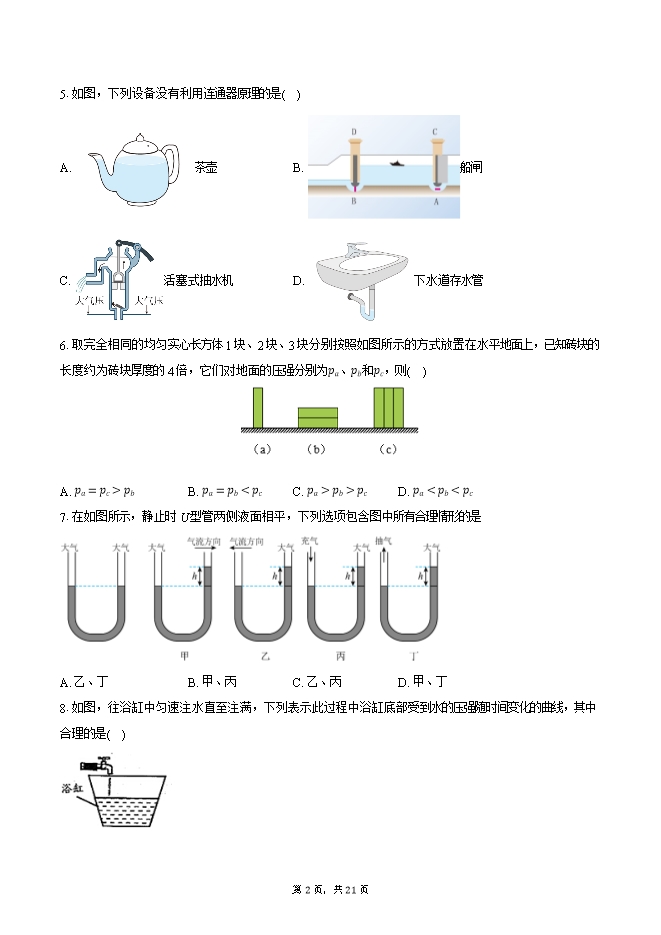 【内容简介】1.关于压力、压强,下列说法中正确的是( )A. 压力是由于物体受到的重力而产生的B. 压力的方向总是竖直向下的C. 在压力一定时,减小受力面积可以增大压强D. 压力大,压强一定大2.如图,甲、乙两人在完全相同的沙滩上散步,留下深浅相同、大小不同的脚印。则甲( ) A. 所受的重力较大 B. 相同面积上受到的压力更大C. 对沙滩的压强较大 D. 压力与受力面积比值更大3.著名的“木桶理论”:是指用木桶来装水,若制作木桶的木板参差不齐,那么它能盛下水的容量,不是由这个木桶中最长的木板来决定的,而是由最短的木板来决定,所以它又被称为“短板效应”。那么决定木桶底部受到水的压强大小的是( )A. 木桶的粗细 B. 木桶的轻重 C. 最短的一块木板 D. 最长的一块木板4.以下情境与大气压强无关的是( )A. 覆在管口的纸片不掉落 B. 用吸管吸饮料C. 连通器 D. 塑料吸盘吸附在墙上5.如图,下列设备没有利用连通器原理的是( )A. 茶壶 B. 船闸C. 活塞式抽水机 D. 下水道存水管6.取完全相同的均匀实心长方体1块、2块、3块分别按照如图所示的方式放置在水平地面上,已知砖块的长度约为砖块厚度的4倍,它们对地面的压强分别为p_a、p_b和p_c,则( )7.在如图所示,静止时U型管两侧液面相平,下列选项包含图中所有合理情形的是