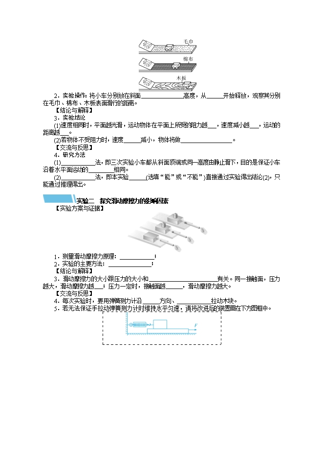 【内容简介】知识点一 牛顿第一定律及惯性1.内容:一切物体在没有受到力的作用时,总保持 状态或 状态。2.理解:(1)该结论是由实验 概括出来的。(2)“总保持静止状态或匀速直线运动状态”是指物体不受外力时,原来静止的物体将永远保持 状态,原来运动的物体将永远做 ,即一切物体都有 性。(3)力不是维持物体运动的原因,力是 物体运动状态的原因。3.惯性(1)定义:一切物体都有 不变的性质,我们把这种性质称为惯性。(2)影响因素:惯性的大小只与物体的 有关,物体的 越大,其运动状态越难以改变,我们就说它的惯性越大。(3)理解:①对任何物体,无论是运动还是静止,都具有惯性;②惯性是维持物体运动状态的原因,力是改变物体运动状态的原因;③惯性不是力。不能把惯性说成是“惯性力”“受到惯性作用”“克服物体的惯性”或“产生惯性”,一般只能说“具有惯性”;④惯性与运动状态无关。(4)利用:如拍打衣服除尘、掷投球、助跑等。(5)危害:如刹车倾倒、走路滑倒和绊倒等。 知识点二 二力平衡1.二力平衡:(1)定义:物体在两个力的作用下保持 或 状态,我们就说这两个力平衡。(2)条件:①同物:作用在 物体上;②等大:两个力大小 ;③反向:两个力的方向 ;④共线:两个力的方向在 直线上。2.平衡力和相互作用力的区别一对平衡力 一对相互作用力不同点 作用在同一个物体上 分别作用在两个物体上不一定为同性质的力 一定为同性质的力其中一个力消失,另一个力不受影响 同时产生,同时消失相同点 大小相等,方向相反,作用在一条直线上3.运动状态和力的关系物体受力情况 物体运动状态 说明不受力或受平衡力 静止或匀速直线运动 力不是维持物体运动的原因受非平衡力 运动快慢或方向改变 力是改变物体运动状态的原因 知识点三 摩擦力1.定义:两个相互接触的物体,当它们要发生或已发生 时,在接触表面上会产生一种阻碍 运动的力。