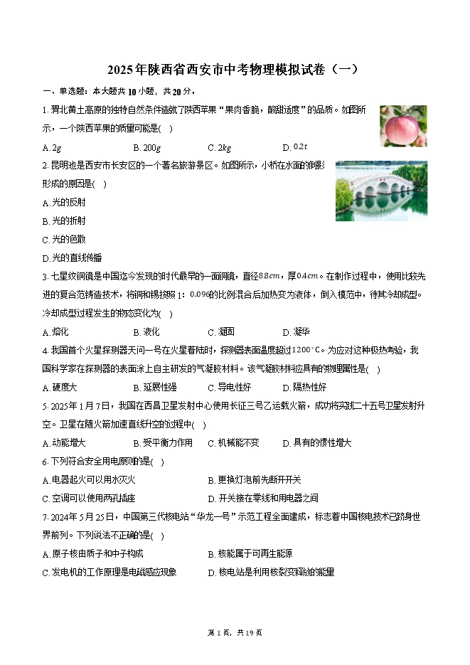 【内容简介】1.渭北黄土高原的独特自然条件造就了陕西苹果“果肉香脆,酸甜适度”的品质。如图所示,一个陕西苹果的质量可能是( )A. 2g B. 200g C. 2kg D. 0.2t2.昆明池是西安市长安区的一个著名旅游景区。如图所示,小桥在水面的倒影形成的原因是( )A. 光的反射B. 光的折射C. 光的色散D. 光的直线传播3.七星纹铜镜是中国迄今发现的时代最早的一面铜镜,直径8.8cm,厚0.4cm。在制作过程中,使用比较先进的复合范铸造技术,将铜和锡按照1:0.096的比例混合后加热变为液体,倒入模范中,待其冷却成型。冷却成型过程发生的物态变化为( )A. 熔化 B. 液化 C. 凝固 D. 凝华4.我国首个火星探测器天问一号在火星着陆时,探测器表面温度超过1200^∘ C。为应对这种极热考验,我国科学家在探测器的表面涂上自主研发的气凝胶材料。该气凝胶材料应具有的物理属性是( )A. 硬度大 B. 延展性强 C. 导电性好 D. 隔热性好5.2025年1月7日,我国在西昌卫星发射中心使用长征三号乙运载火箭,成功将实践二十五号卫星发射升空。卫星在随火箭加速直线升空的过程中( )A. 动能增大 B. 受平衡力作用 C. 机械能不变 D. 具有的惯性增大6.下列符合安全用电原则的是( )A. 电器起火可以用水灭火 B. 更换灯泡前先断开开关C. 空调可以使用两孔插座 D. 开关接在零线和用电器之间7.2024年5月25日,中国第三代核电站“华龙一号”示范工程全面建成,标志着中国核电技术已跻身世界前列。下列说法不正确的是( )A. 原子核由质子和中子构成 B. 核能属于可再生能源C. 发电机的工作原理是电磁感应现象 D. 核电站是利用核裂变释放的能量