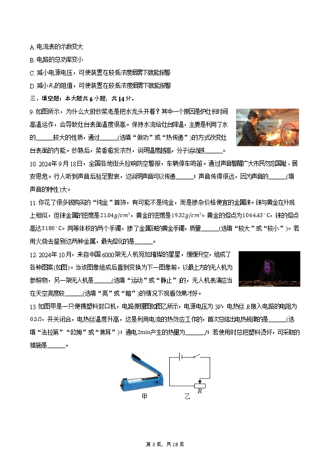 【内容简介】1.蜡花是一种非常受欢迎的手工艺品。把蜡块放入一个铁皮的易拉罐中放在火上烤,蜡块逐渐变软熔化后,先把拇指和食指放碗里沾一下冷水,然后取出一些蜡油捏在钢丝上,蜡油凝固后,一朵漂亮的梅花就“盛开”了。下面说法正确的是( )A. 蜡片是晶体B. 手指沾冷水的目的是为了保证“花瓣”完整C. 蜡片凝固时温度不变D. 蜡片凝固时放热2.古代诗人对月亮的描绘充满了丰富的情感和深刻的哲理,月亮在他们的诗中常常象征着思乡、相思和时间的流逝。下列对古诗文中铁发的光现象与原理解释相符的是( )A. 举杯邀明月,对影成三人——“对影成三人”是光的反射现象B. 虾蟆新食月,金饼曲如钩——“虾蟆新食月”是光的色散现象C. 池水映明月,潭清疑水浅——“池水映明月”是光的反射现象D. 野旷天低树,江清月近人——“江清月近人”是光的折射现象3.“全国中小学安全教育平台”中强调了安全用电,下列做法符合安全用电原则的是( )A. 通电导线外面有一层绝缘皮,所以可以在上面晾湿衣服B. 手机充电变热时,不应该用正在充电的手机打游戏C. 在同一个插座上可以同时使用多个大功率用电器D. 有人触电时,应该直接徒手去救,争取救助时间4.2023年9月21日“天宫课堂”第四课正式开讲,“太空教师”景海鹏、朱杨柱、桂海潮给广大青少年带了一场精彩的太空科普课授课活动并取得圆满成功下列说法正确的是( )A. 在太空舱内,三名宇航员不能直接对话B. 航天员的声音是靠超声波传回地球的C. 航天员发出声音是因为声带在振动D. 航天员在太空做火焰实验的现象与地球完全相同