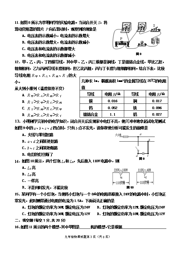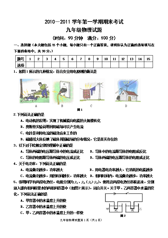 鲁教版2010—2011学年第一学期期末考试九年级物理试题及答案
