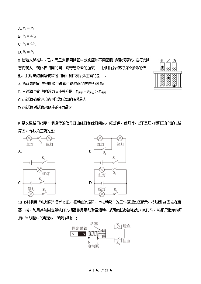 【内容简介】1.将手机“背景灯光提示”和“声音提示”功能打开,放到真空钟罩中,用抽气机抽去中空气。然后打电话呼叫手机,看到背景灯光亮却听不到铃声。该现象说明( )A. 声音和电磁波都能在真空中传播B. 声音和电磁波都不能在真空中传播C. 声音能在真空中传播,电磁波不能在真空中传播D. 声音不能在真空中传播,电磁波能在真空中传播2.如图是有关光现象的四种情景,其中描述错误的是( ) A. 甲图中蜡烛略微靠近小孔,光屏上倒立放大的实像会略微变大B. 乙图中用手电筒照射白墙上的小镜子,人在手电筒的位置看,墙是亮的镜子是暗的C. 丙图中太阳光经三棱镜折射后,在竖直白屏上从上到下的光带颜色依次是红橙黄绿蓝靛紫D. 丁图中是近视眼的成像情况,应该配戴凹透镜进行校正3.如图所示,密封的锤形玻璃泡内装有少量碘颗粒,碘的熔点约为114^∘ C。打开电吹风热风挡对玻璃泡加热,温度约为60^∘ C,一段时间后,观察到玻璃泡内弥漫着紫红色的碘蒸气,停止加热,冷却后玻璃泡内又出现碘颗粒。关于这个过程,下列说法中正确的是( )A. 加热时,碘颗粒熔化B. 冷却时,碘蒸气凝固C. 加热时,碘颗粒升华D. 冷却时,碘蒸气液化4.电冰箱通电后,制冷剂被压缩机从蒸发器内吸出、压缩后进入冷凝器,随后进入蒸发器……,通过这样的循环,实现制冷效果,如图所示。下列说法正确的是( )A. 制冷剂需选用不容易汽化的物质B. 制冷剂需选用汽化吸热能力弱的物质C. 制冷剂在冷凝器内液化放出热量D. 打开工作中的冰箱门,最终能使整个房间内降温