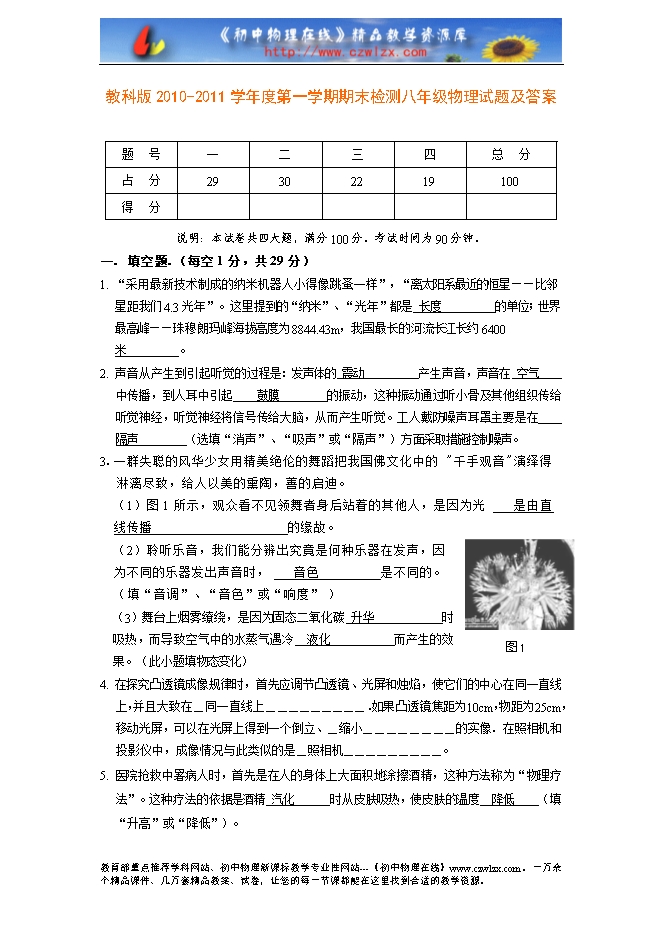 教科版2010-2011学年度第一学期期末检测八年级物理试题及答案