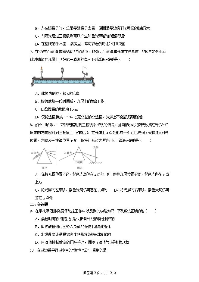 【内容简介】1.如果声音和光都从空气传入水中,下列关于其速度变化正确的是( )A.声速变大,光速变小 B.声速变大,光速不变C.声速、光速都变小 D.声速、光速都不变2.关于光现象,下列说法错误的是( )A.一束太阳光可以通过三棱镜分解为不同的色光B.用放大镜看报纸时,为了看到更大的清晰的像,应减小放大镜到报纸的距离C.小芳面向穿衣镜站在镜前1.5m处,当她靠近平面镜0.5m时,则镜中像与她相距2mD.“海市蜃楼”的形成,是由于光发生了折射3.下列不能用光的直线传播来解释的现象是( )A.日食和月食B.影的形成C.小孔成像D.发生雷电时,先看到闪电,然后才能听到雷鸣声4.如图,点燃的蜡烛放在距小孔a处,它成的像在距小孔b的半透明纸上,且a大于b,则半透明纸上的像是 A.倒立、放大的虚像 B.正立、缩小的虚像C.倒立、缩小的实像 D.正立、放大的实像5.下列关于镜子的说法不正确的是( )A.汽车的后视镜是凸面镜B.潜水艇的潜望镜是平面镜C.太阳灶是利用凹面镜聚光的原理工作的D.上述三种面镜所成的像都是实像6.有关光现象,以下说法正确的是( )A.阳光透过树叶间的缝隙射到地面上,形成的光斑是倒立的虚像
