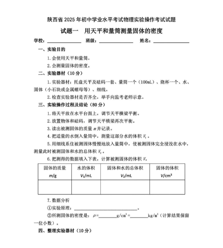 2025年陕西省初中学业水平考试实验操作考试物理试题(扫描版)