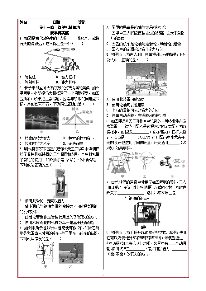【内容简介】2025-2026学年苏科版物理九年级上册同步练习:第十一章 简单机械和功 跨学科实践(附答案)