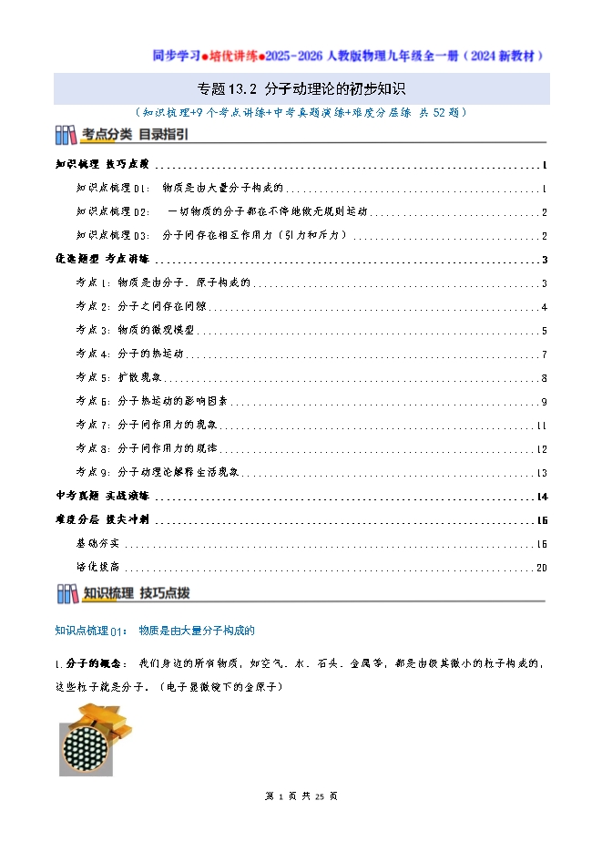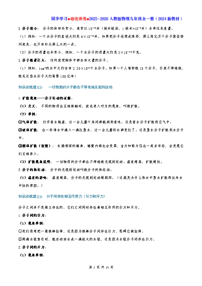 【内容简介】知识点梳理01: 物质是由大量分子构成的1.分子的概念: 我们身边的所有物质,如空气、水、石头、金属等,都是由极其微小的粒子构成的,这些粒子就是分子。(电子显微镜下的金原子) 2.分子很小: 分子的体积非常小,通常以10⁻¹⁰米(纳米级别,1纳米=10⁻⁹米)为单位来度量。(1)例如:一个水分子的直径大约是4×10⁻¹⁰米。如果把分子设想成球形,那么将亿万个分子紧密排列起来,也只有针尖那么大的一点。(2)分子的质量也非常小,例如,一个水分子的质量大约是3×10⁻²⁶千克。3.分子数量巨大: 任何宏观物体中都含有大量的分子。(1)例如,1cm³的水中大约含有3.35×10²²个水分子。如果一个人每秒数10个分子,日夜不停地数,数完这些水分子大约需要100亿年!知识点梳理02: 一切物质的分子都在不停地做无规则运动1.扩散现象——分子运动的证据:(1)定义: 不同的物质在互相接触时,彼此进入对方的现象,叫做扩散。(2)举例:①气体扩散: 打开香水瓶盖,过一会儿整个房间都能闻到香味。这是香水分子扩散到空气中。②液体扩散: 在一杯清水中滴入一滴红墨水,过一会儿整杯水都变红了。这是墨水分子扩散到水分子