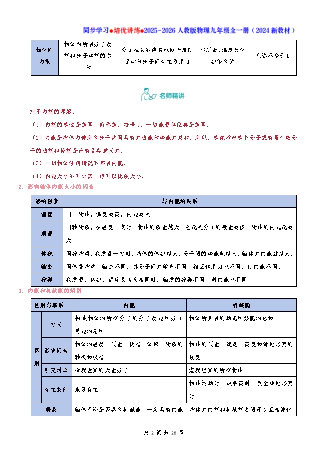 【内容简介】对于内能的理解:(1)内能的单位是焦耳,简称焦,符号J。一切能量单位都是焦耳。(2)内能是物体内部所有分子共同具有的动能和势能的总和,所以,单纯考虑单个分子或有限个数分子的动能和势能是没有现实意义的。(3)一切物体任何情况下都有内能。(4)内能大小不可计算,但可以比较大小。2. 影响物体内能大小的因素影响因素 与内能的关系温度 同一物体,温度越高,内能越大质量 同种物质,在温度一定时,物体的质量越大,也就是分子的数量越多,物体的内能就越大体积 同种物质,在质量一定时,物体的体积越大,分子间的势能就越大,物体的内能就越大。物态 同体重物质,物态不同,其分子间的距离不同,相互作用力也不同,则内能不同。种类 在质量、体积、温度及状态相同时,物质的种类不同,则内能也不同3. 内能和机械能的辨别区别与联系 内能 机械能区别 定义 构成物体的所有分子的分子动能和分子势能的总和 物体所具有的动能和势能的总和影响因素 物体的温度、质量、状态、体积、物质的种类和状态 物体的质量、速度、高度和弹性形变的程度研究对象 微观世界的大量分子 宏观世界的所有物体存在条件 永远存在 物体运动时,被举高时,发生弹性形变时联系 物体无论是否具有机械能,一定具有内能;物体的内能和机械能之间可以互相转化知识点梳理02: 热传递和内能的改变1.热传递的改变物体的内能(1)条件:不同物体或同一物体的不同部分之间存在温度差。(2)方向:由高温物体传递给低温物体,或由同一物体的高温部分传递给低温部分。(3)过程:高温物体:放出热量,内能减小;低温物体:吸收热量,内能增加。2. 做功可以改变物体的内能