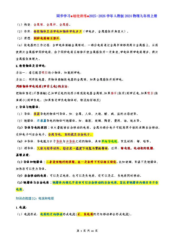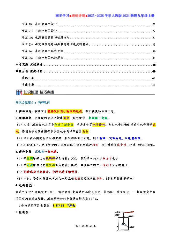 【内容简介】知识点梳理01:两种电荷1.物体带电:物体有了能够吸引轻小物体的性质,我们就说物体带了电。2.摩擦起电:用摩擦的方法使物体带电。能的转化:机械能→电能。(1)实质:摩擦起电并不是创造了新电荷,而是发生了电子转移,失去电子的物体因缺少电子而带正电,得到电子的物体因有多余的电子而带等量的负电。(2)甲乙两不同的物体互相摩擦,若甲物体带了正电,则乙物体一定带负电,且电量相等。(3)通常情况下,原子核带的正电数与电子带的负电数相等,原子对外呈电中性,此时,物体不带电。3.两种电荷:正电荷和负电荷。(1)被丝绸摩擦过的玻璃棒带正电荷;实质:玻璃棒中的原子失去了电子。 (2)被毛皮摩擦过的橡胶棒带负电荷;实质:橡胶棒中的原子得到了多余的电子。(3)同种电荷互相排斥,异种电荷互相吸引。(4)中和:等量的异种电荷放在一起互相抵消的现象叫做中和。(中和后物体不带电)4.电荷量(Q):电荷的多少叫做电荷量(Q),简称电荷;电荷量的单位是库仑,简称库,符号是 C。 一根实验室中常用的玻璃棒或橡胶棒,摩擦后所带的电荷量大约只有10-7 C。 1个电子所带的电量是:1.6×10 -19库仑。