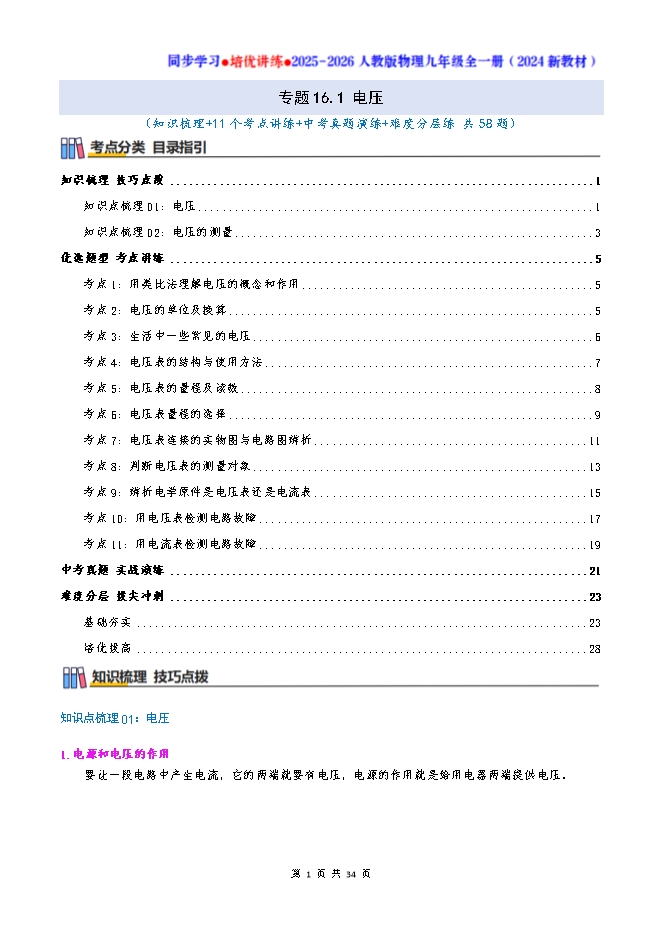 【内容简介】知识点梳理01:电压1.电源和电压的作用要让一段电路中产生电流,它的两端就要有电压,电源的作用就是给用电器两端提供电压。图示 现象 水管中水的流动形成水流 电路中电荷的定向移动形成电流组成类比 抽水机(保持一定的水压)→电源(保持一定的电压)水管(传输水流)→导线(传输电流)水轮机(利用水能的设备)→灯泡(利用电能的设备——用电器)阀门(控制水流的通断)→开关(控制电流的通断)分析 (1)水的定向流动形成水流;(2)水压是水定向流动形成水流的原因;(3)抽水机是产生水压的装置。 (1)电荷定向移动形成电流;(2)电压是电荷定向移动形成电流的原因;(3)电源是提供电压的装置。作用 抽水机提供水压形成持续水流 电源提供电压形成持续电流总结 (1)电压是形成电流的原因;(2)电源时提供电压的装置 1. 说电压时,要说“用电器”两端的电压,或“某两点”间的电压。2. 电源的作用是使导体的两端产生电压,电压的作用是使自由电荷定向移动形成电流。电源将其他形式的能转化成电能时,使电源的正极聚集正电荷,负极聚集负电荷。(1)某段电路中有电流,该电路两端一定有电压;某段电路两端有电压,该段电路中不一定有电流。因为电路中是否有电流还取决于电路是不是通路。要使电路中有持续的电流,必须同时满足两个条件: ①有电源提供电压;②电路必须是通路。(2)不能说电路哪一点存在电压,表述电压时,必须指明电路中“哪一部分电路(或哪个用电器)两端的电压”,或“哪两点间的电压”。(3)从能量角度看,对外供电时,电源提供用电器把电能转化为其他形式的能。2. 电压的符号单位(1)符号:物理学中,电压常用“U”表示。(2)单位