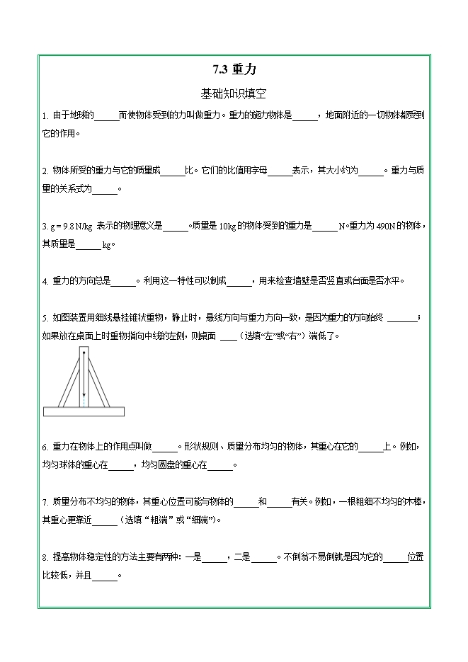 【内容简介】第七章 第三节 重力—2025-2026学年人教版物理八年级下学期预习基础知识填空(附答案)