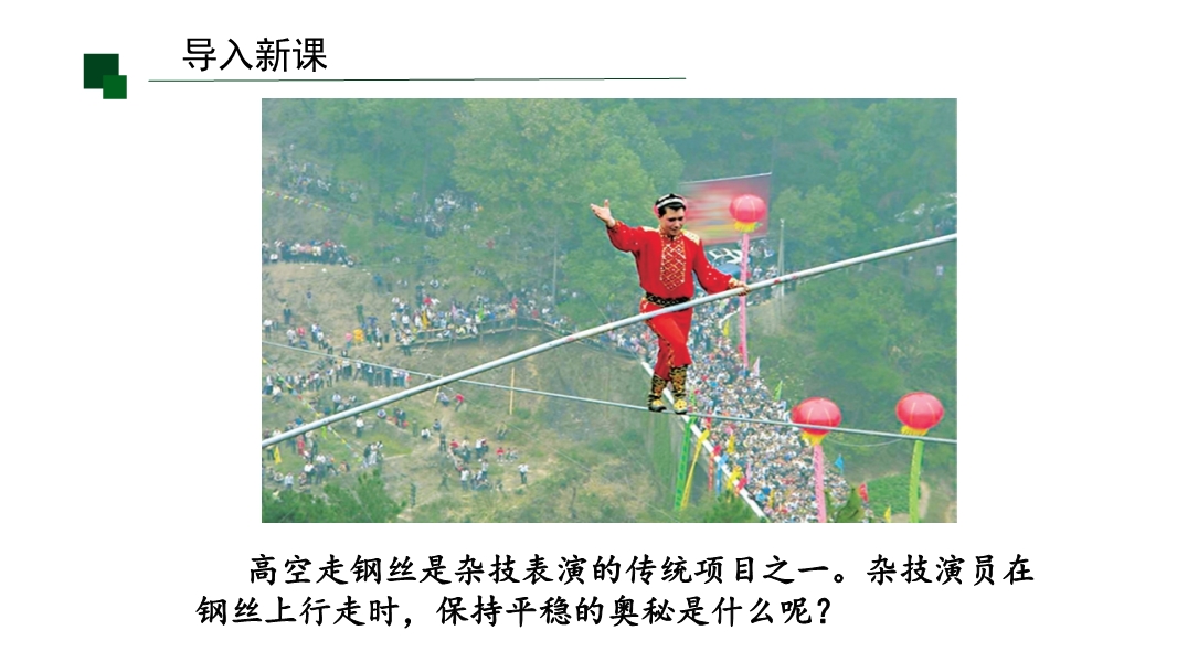 【内容简介】该课件聚焦“二力平衡”核心知识点,通过高空走钢丝现象导入,引导学生观察静止花瓶、匀速行驶列车等实例建立平衡状态概念,再通过实验探究二力平衡条件,最后关联第七章摩擦力测量实验,构建完整知识脉络。其亮点在于以问题链驱动科学探究,用轻质卡片实验控制重力影响,分析不同受力条件现象得出“同体、等大、反向、共线”结论,体现科学思维与探究素养。小结结构化呈现要点,结合生活实例,助力学生形成物理观念,教师可借助其互动设计提升教学效率。