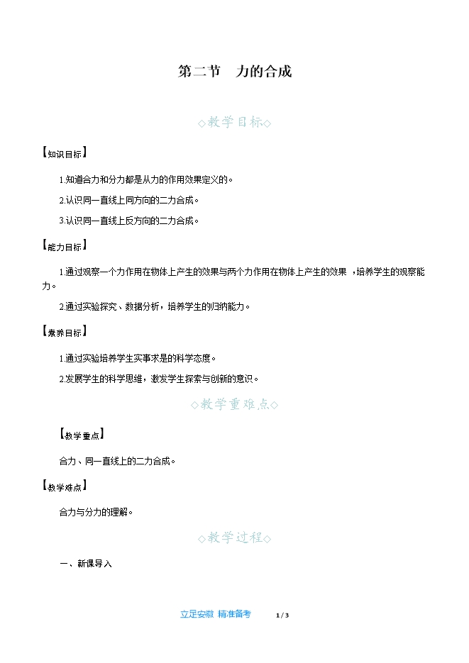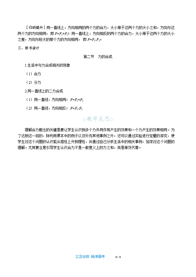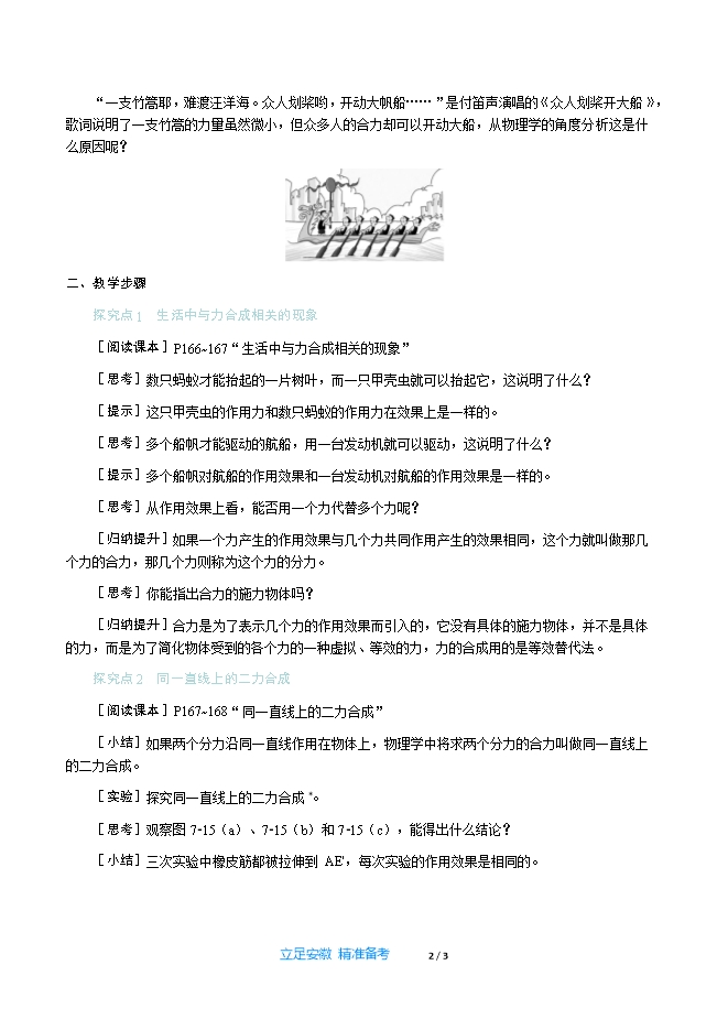 【内容简介】一、新课导入“一支竹篙耶,难渡汪洋海。众人划桨哟,开动大帆船……”是付笛声演唱的《众人划桨开大船》,歌词说明了一支竹篙的力量虽然微小,但众多人的合力却可以开动大船,从物理学的角度分析这是什么原因呢? 二、教学步骤探究点1 生活中与力合成相关的现象[阅读课本]P166~167“生活中与力合成相关的现象”[思考]数只蚂蚁才能抬起的一片树叶,而一只甲壳虫就可以抬起它,这说明了什么?[提示]这只甲壳虫的作用力和数只蚂蚁的作用力在效果上是一样的。[思考]多个船帆才能驱动的航船,用一台发动机就可以驱动,这说明了什么?[提示]多个船帆对航船的作用效果和一台发动机对航船的作用效果是一样的。[思考]从作用效果上看,能否用一个力代替多个力呢?[归纳提升]如果一个力产生的作用效果与几个力共同作用产生的效果相同,这个力就叫做那几个力的合力,那几个力则称为这个力的分力。[思考]你能指出合力的施力物体吗?[归纳提升]合力是为了表示几个力的作用效果而引入的,它没有具体的施力物体,并不是具体的力,而是为了简化物体受到的各个力的一种虚拟、等效的力,力的合成用的是等效替代法。探究点2 同一直线上的二力合成[阅读课本]P167~168“同一直线上的二力合成”[小结]如果两个分力沿同一直线作用在物体上,物理学中将求两个分力的合力叫做同一直线上的二力合成。[实验]探究同一直线上的二力合成*。[思考]观察图7⁃15(a)、7⁃15(b)和7⁃15(c),能得出什么结论?[小结]三次实验中橡皮筋都被拉伸到AE',每次实验的作用效果是相同的。