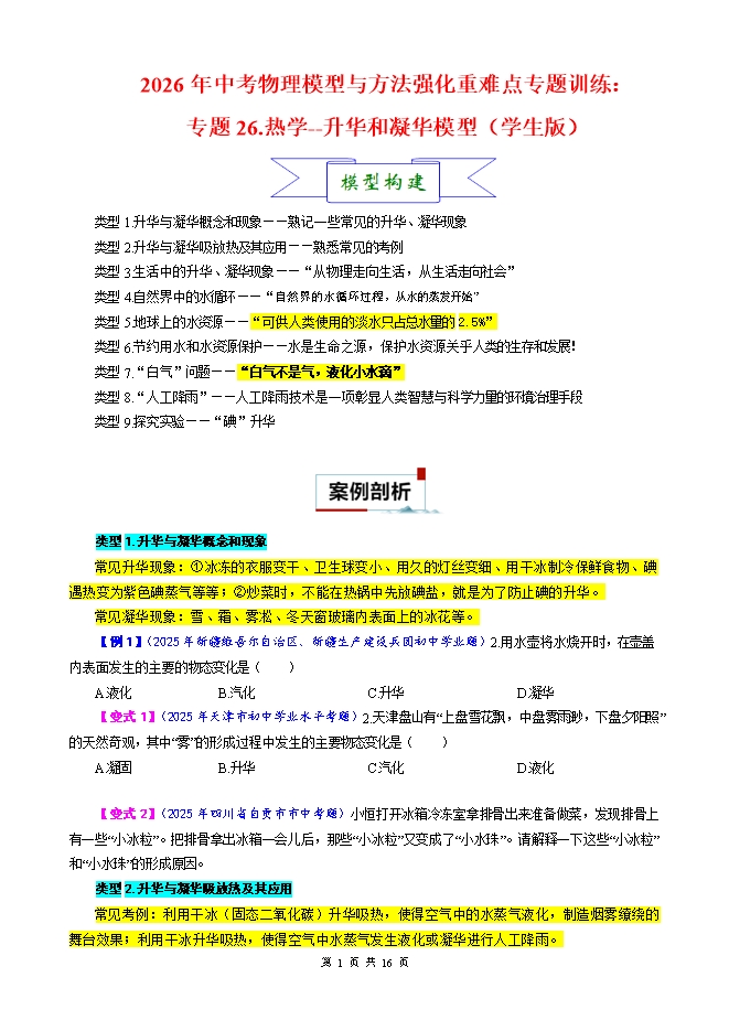 【内容简介】2026年中考物理模型与方法强化重难点专题训练:专题26.热学--升华和凝华模型(学生版和教师版)