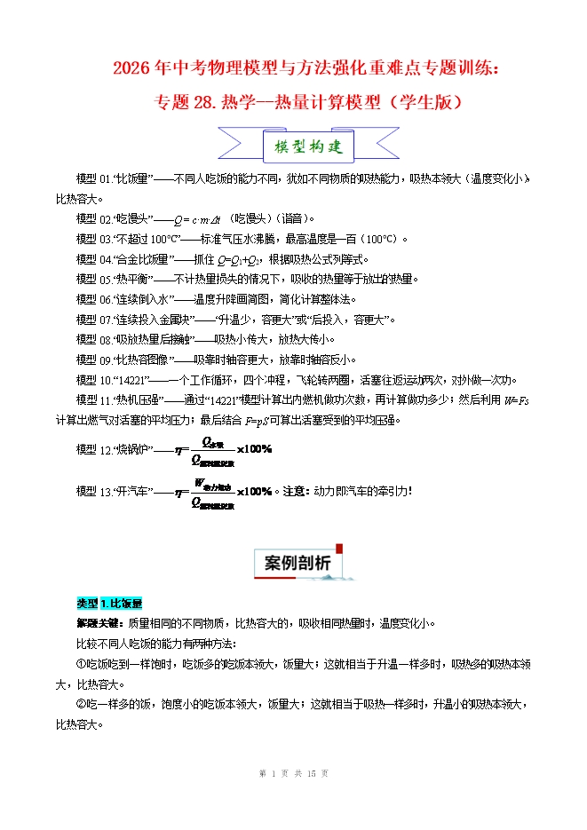 【内容简介】2026年中考物理模型与方法强化重难点专题训练:专题28.热学--热量计算模型(学生版和教师版)