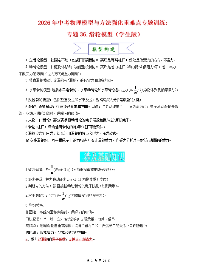 【内容简介】2026年中考物理模型与方法强化重难点专题训练:专题36.滑轮模型(学生版和教师版)