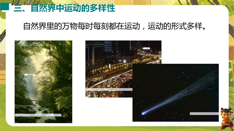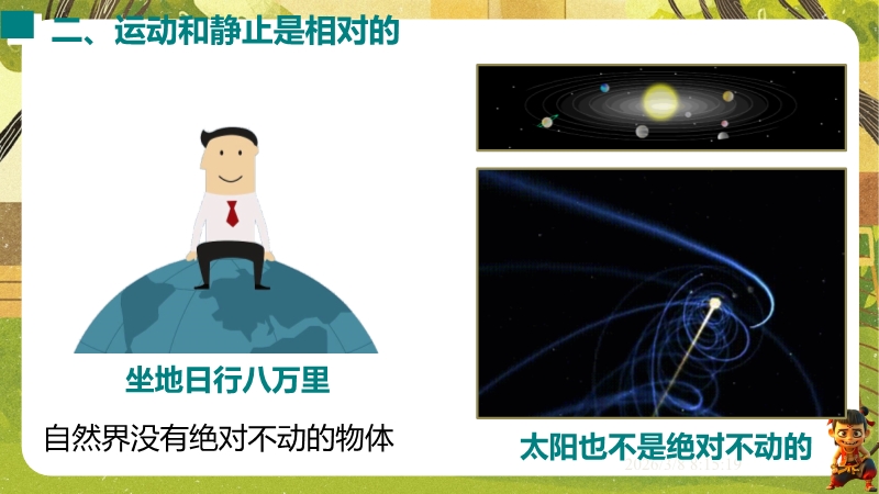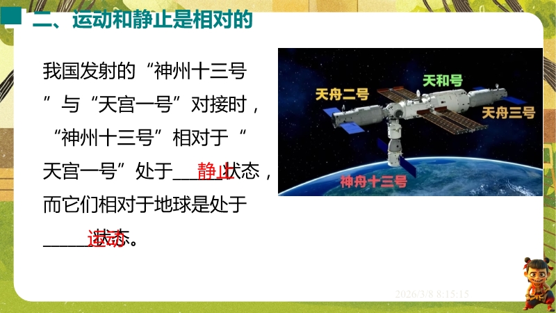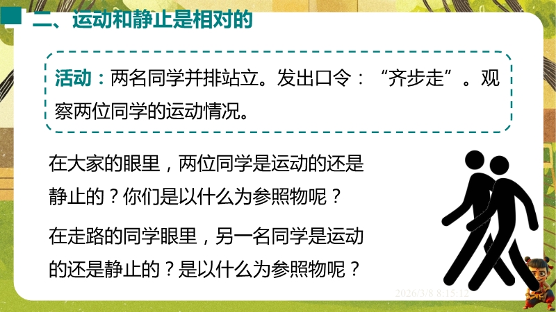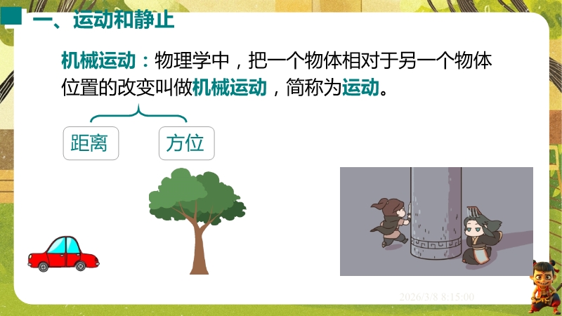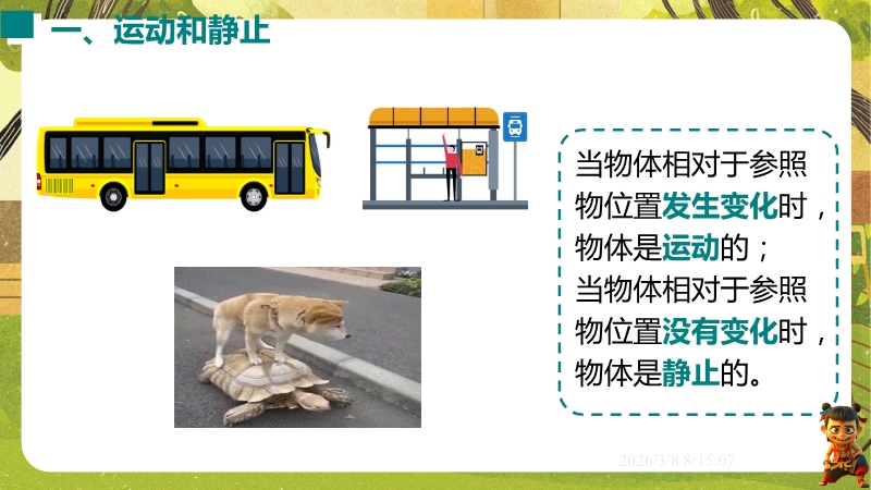 【内容简介】课件聚焦“运动的描述”,涵盖机械运动定义、参照物选择及运动静止相对性等核心知识点。通过孩子游戏活动、诗句情境等导入,引导学生从具体现象到抽象概念,构建“实例感知-定义理解-应用判断”的学习支架。其亮点在于融合科学思维与科学探究,以中考题、“奋斗者”号等新情境及“刻舟求剑”跨学科实例,培养学生模型建构与推理能力。采用活动探究与分层练习,课堂小结系统梳理知识,助力学生深化理解,也为教师提供丰富教学资源。