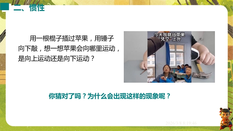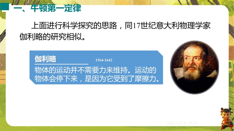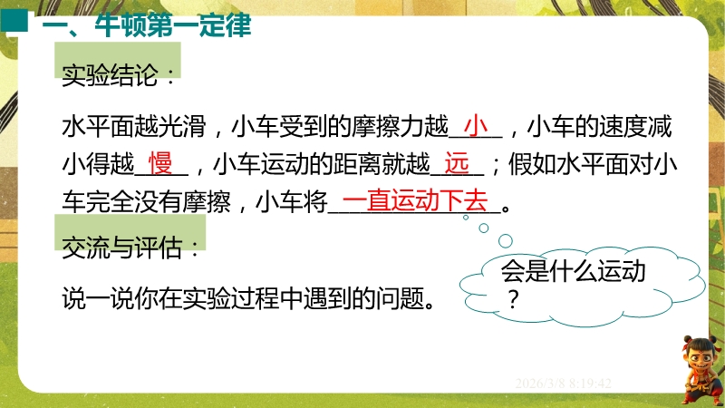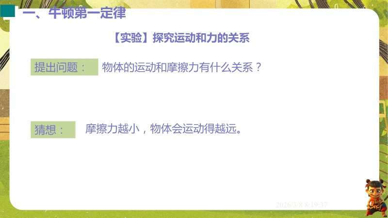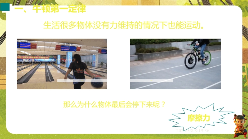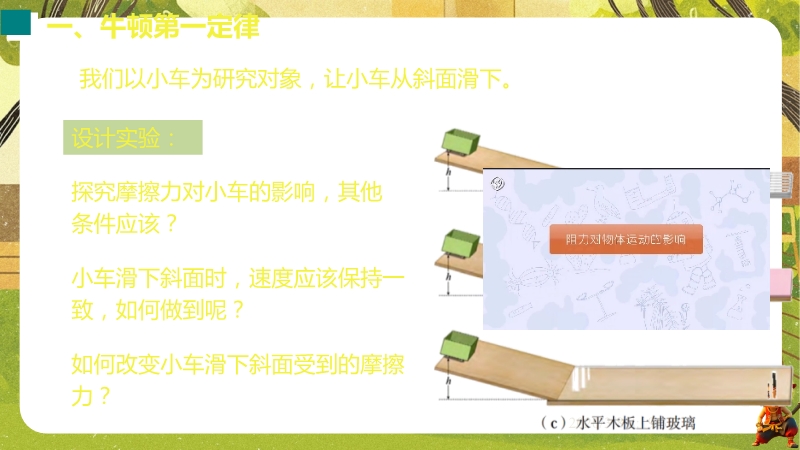 【内容简介】课件聚焦“牛顿第一定律 惯性”核心知识点,通过汽车安全带模拟碰撞实验、保龄球滑行等生活实例导入,引出摩擦力对运动的影响,以探究阻力对物体运动的影响实验为支架,衔接伽利略研究到牛顿第一定律的总结,再过渡到惯性概念及生活应用,构建完整知识脉络。其亮点在于以科学探究为主线,通过控制变量法和转换法设计阻力影响实验,结合伽利略理想实验培养科学推理能力,融入汽车启动刹车、牛奶洒出等生活情境及中考题,强化物理观念与科学态度。小结清晰梳理实验结论与惯性现象,帮助学生构建运动和力的物理观念,教师可直接利用实验设计与习题提升教学效率。