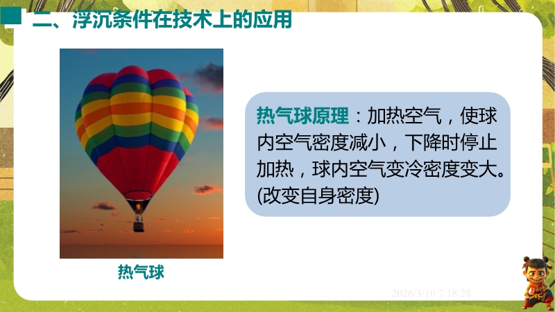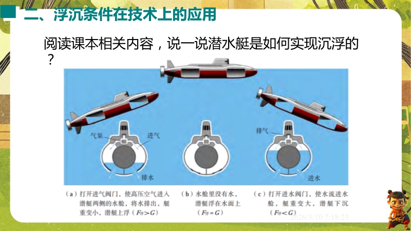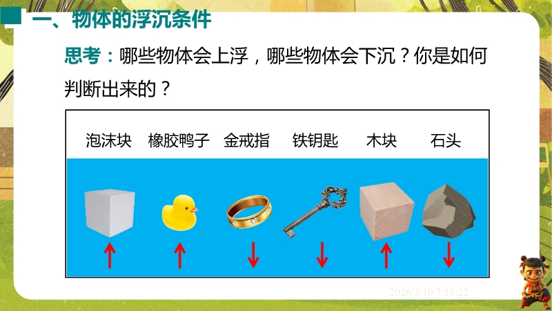 【内容简介】课件聚焦“物体的浮沉”,通过“听话的小瓶”魔术和鸡蛋在盐水里的浮沉实验导入,引导学生观察现象,分析受力,逐步总结出浮沉条件(浮力与重力、液体与物体密度关系),构建从实验到原理的学习支架。其亮点在于以科学探究为核心,结合鸡蛋浮沉实验、潜水艇等生活应用实例,通过表格梳理浮沉条件,培养学生科学思维和物理观念。分层练习题(基础题、中考题)助力巩固,课堂小结系统归纳,既帮助学生提升探究能力和知识应用能力,也为教师提供完整教学资源,提高教学效率。