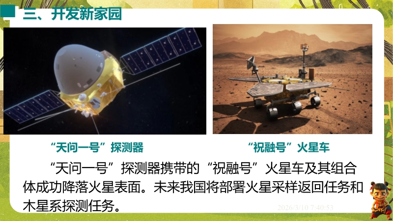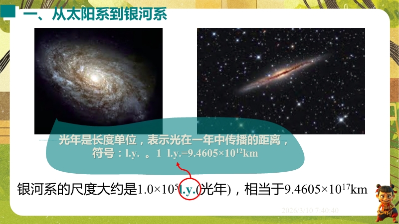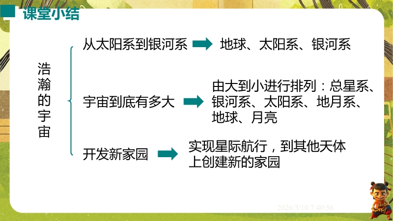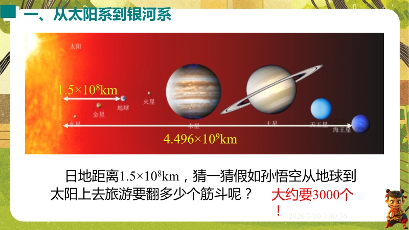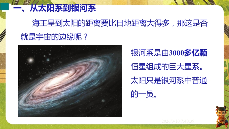 【内容简介】课件围绕“浩瀚的宇宙”,系统讲解太阳系、银河系、宇宙的尺度与演化及人类探索实践。通过“漫天星斗”情境导入,从地球到太阳系再到银河系层层递进,结合数据、趣味计算、示意图和中考题构建学习支架。其亮点在于融入中考考点,运用类比法(如气球膨胀类比宇宙大爆炸)培养科学思维,结合“天问一号”等实例渗透科学态度与责任。采用数据对比、情境设问等方法,帮助学生建立物质观念和尺度认知,教师可直接使用中考题和实例提升教学效率。
