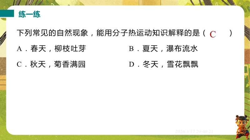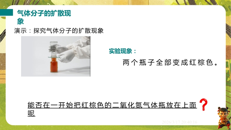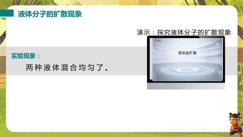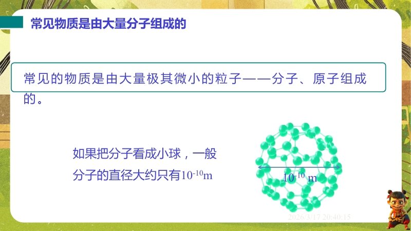 【内容简介】课件聚焦“物质结构的微观模型”,通过露珠含分子数量等生活实例导入,结合气体、液体、固体扩散实验,引导学生从宏观现象到微观本质,构建“物质由分子组成、分子运动与温度相关、分子间存在间隙和作用力”的知识脉络,形成学习支架。其亮点在于以实验探究为核心,通过二氧化氮扩散、铅块结合等演示及固液气特征对比表,落实科学探究与模型建构。结合“菊香满园”等生活实例题,强化物理观念,帮助学生用物理学视角解释现象,提升科学思维,同时为教师提供清晰教学逻辑与丰富素材,提高教学效率。