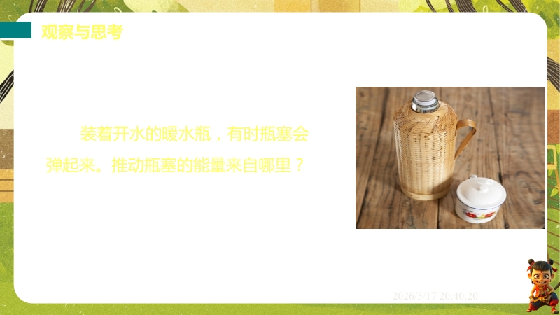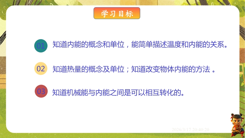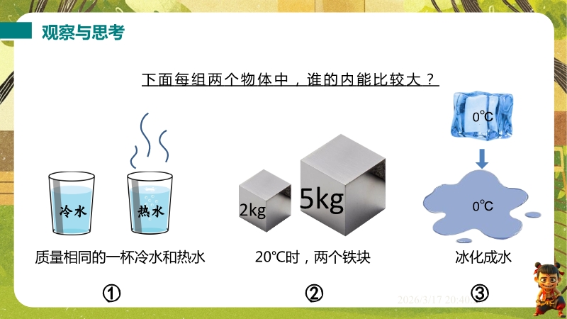 【内容简介】课件聚焦物体的内能及其变化,涵盖内能的概念、单位、影响因素,热量的定义,以及改变内能的热传递和做功两种方式。通过暖水瓶瓶塞弹起等生活现象导入,结合足球动能类比分子动能、弹簧势能类比分子势能,构建从定义到影响因素再到改变方式的学习支架,辅以实例分析和练习题巩固。其亮点在于以科学探究为核心,通过空气压缩引火仪、水蒸气冲橡皮塞等实验,结合“烤火与搓手”等生活实例,引导学生理解能量转化与转移。利用温度、热量、内能对比表格培养科学思维,结构化知识点总结强化物理观念。既帮助学生深化概念理解,又为教师提供丰富教学资源,提升课堂效率。