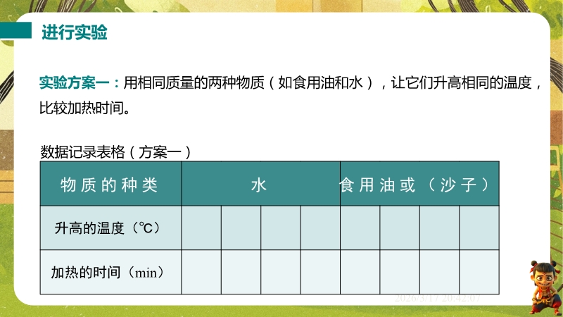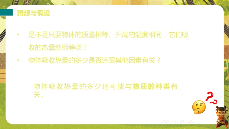 【内容简介】课件聚焦“比热容”核心知识点,通过撒哈拉沙漠昼夜温差的“观察与思考”导入,以“比较不同物质吸热情况”的问题链引出影响因素,经猜想、实验设计(控制变量法、转换法)构建知识支架,帮助学生理解物质吸热能力差异及导热性概念。其亮点在于以科学探究为主线,通过两种实验方案培养科学思维,结合比热容表和生活实例(暖气片、炒菜锅手柄)深化物理观念。融入中考考点及练习题,助力学生巩固知识,教师可直接用于课堂教学,提升教学效率。
