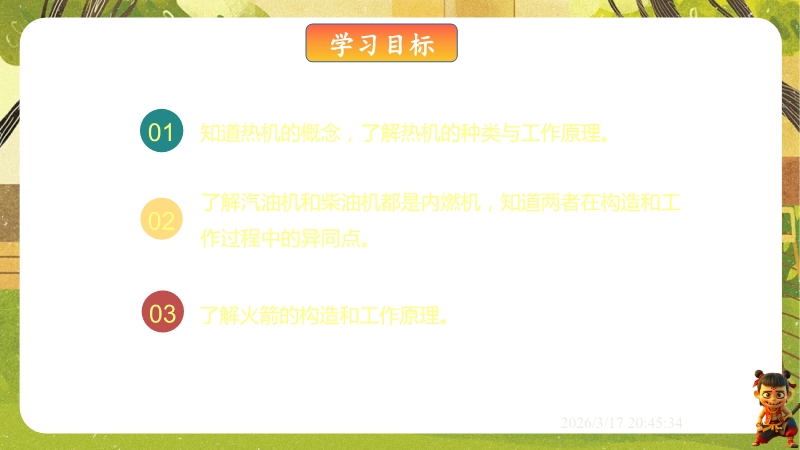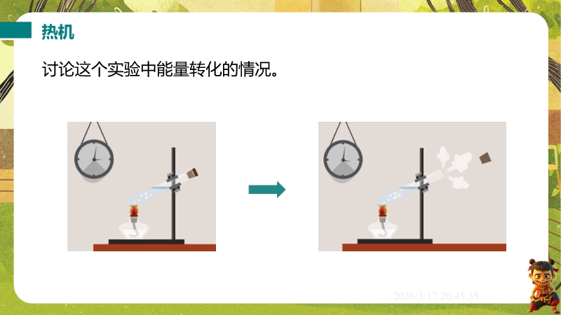 【内容简介】课件围绕热机展开,涵盖热机的概念、种类、内燃机(汽油机、柴油机)的构造与四冲程工作原理及火箭的工作原理。通过“观察与思考”(汽车、列车等运动实例)和实验(酒精燃烧推动塞子)导入,引导学生建立能量转化(化学能→内能→机械能)的认知支架。其亮点在于以科学探究为核心,通过实验分析能量转化过程,结合汽油机四冲程模型建构与汽油机、柴油机对比表格培养科学思维,融入火箭起源历史与长征五号发射视频渗透科学态度与责任。中考题融入帮助学生巩固知识,教师可借此提升教学效率,学生能深化对热机原理的理解。