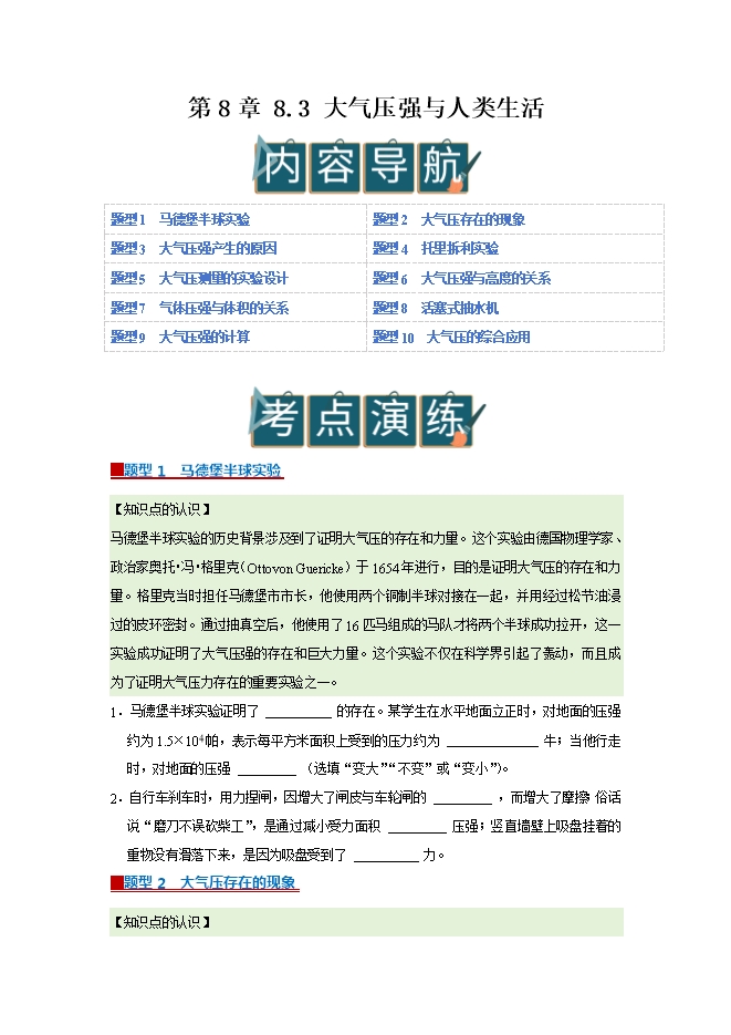 【内容简介】第8章 8.3 大气压强与人类生活--2025-2026学年沪粤版物理八年级下册同步考点演练