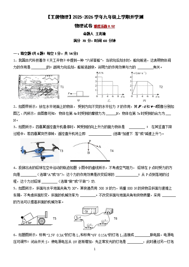 【内容简介】2025-2026学年人教版九年级上学期开学测试卷(原卷版和解析版)【王牌物理】