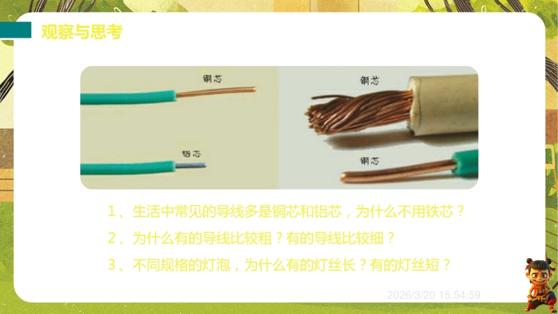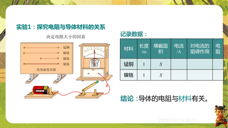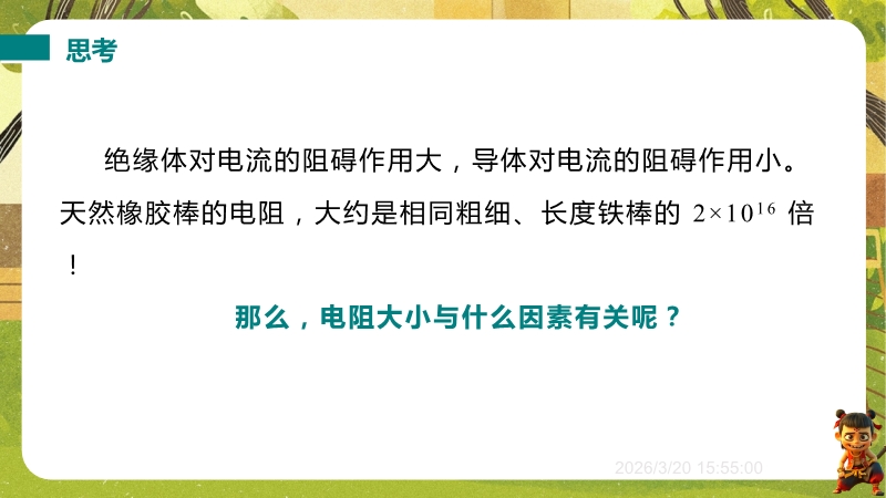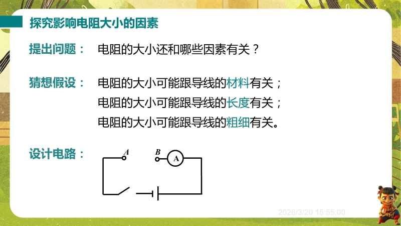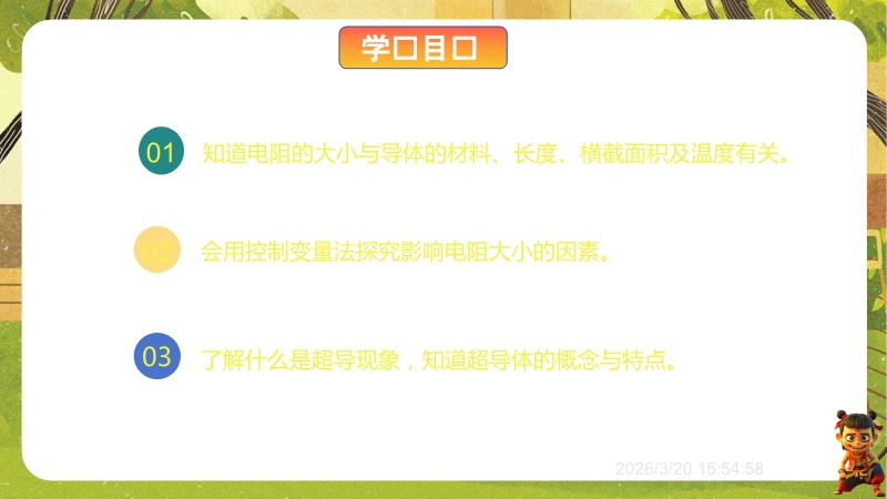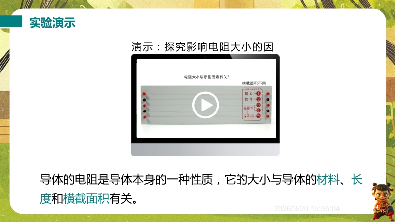 【内容简介】课件聚焦“影响导体电阻大小的因素”,系统讲解电阻与材料、长度、横截面积、温度的关系及超导现象。通过生活实例提问导入,如导线材料选择、粗细差异等,连接学生经验,搭建从生活到物理的学习支架。其亮点在于以控制变量法和转换法设计探究实验,如通过电流表示数比较电阻大小,体现科学探究与科学思维。结合例题、练习巩固应用,超导现象联系科技,助力学生培养探究能力,教师可借助系统实验设计提升教学效率。