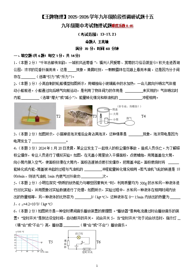 【内容简介】九年级期中考试物理试题(人教版,13-17.2)--2025-2026学年九年级阶段性调研试题十五【王牌物理河南专版】