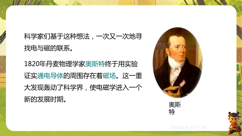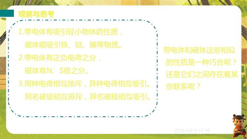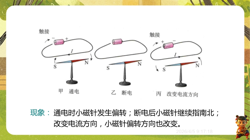 【内容简介】课件聚焦“电流的磁场”,核心涵盖电流的磁效应、通电螺线管磁场及右手螺旋定则。通过“温故知新”复习磁体、磁场等旧知,结合“观察与思考”对比电与磁性质引出联系,以奥斯特实验为桥梁构建新旧知识学习支架。其亮点在于以科学探究为主线,通过奥斯特实验现象分析培养科学思维,用表格对比条形磁体与螺线管磁场深化物理观念,融入中考真题练习提升应用能力。助力学生建立电磁联系认知,教师可依托此资料高效开展探究式教学。