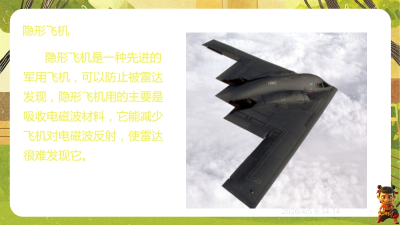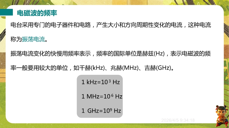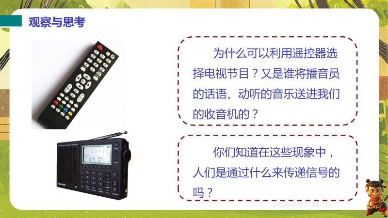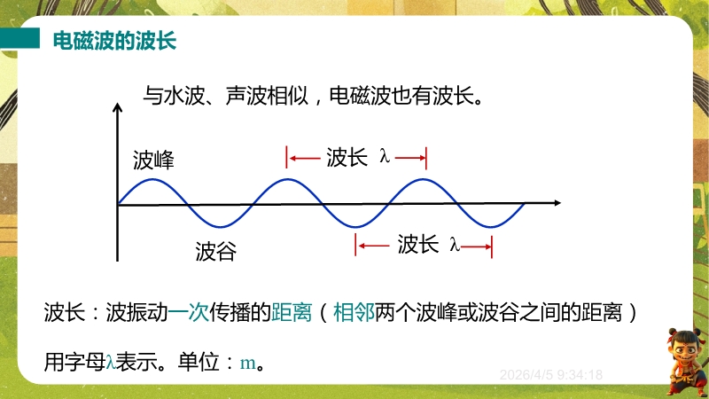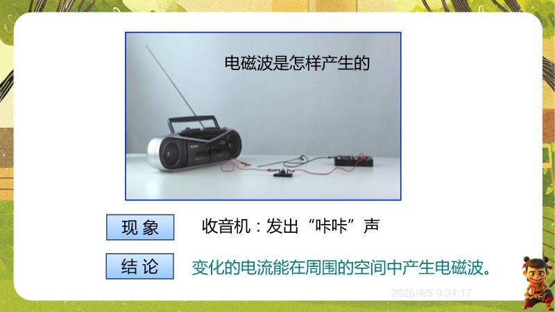 【内容简介】课件围绕电磁波的产生、特征(波长、频率、波速)及应用展开,通过遥控器选台、收音机信号等生活现象导入,结合“探测电磁波产生”演示实验,构建从生活到实验再到规律的学习支架。其亮点在于融合科学探究与物理观念,通过真空钟罩手机实验验证电磁波传播特性,结合电磁波谱图和波速公式培养科学思维,练习题含中考真题及跨学科实践。学生能提升探究能力,教师可高效利用结构化资源教学。