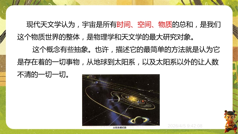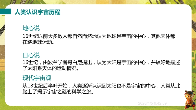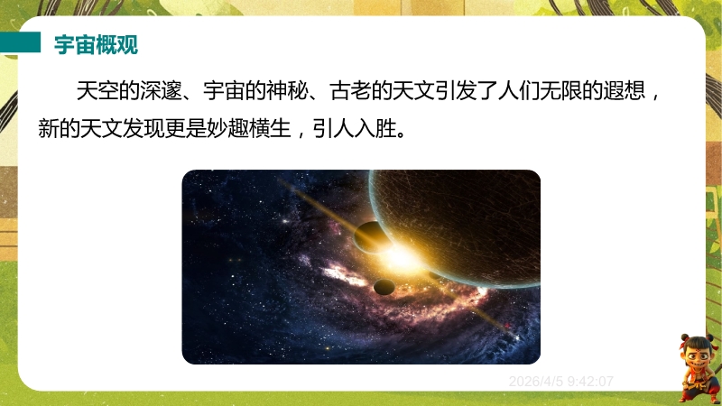 【内容简介】物理课件聚焦“浩瀚的宇宙”,核心讲解宇宙层次结构及人类探索历程,通过“观察与思考”中“银河系外有什么”等问题导入,从地球、太阳系到银河系、河外星系,构建层次化学习支架。其亮点在于结合科学思维(如“地心说—日心说—现代宇宙观”的科学推理)与科学态度与责任(如中国“神舟”五号等航天成就),通过练习题巩固物理观念,帮助学生构建知识体系,教师可高效开展教学。