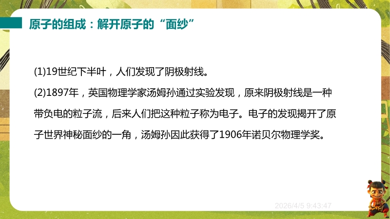 【内容简介】课件围绕“探索微观世界的历程”,系统呈现物质微观尺度、原子核式结构模型及纳米科技等核心知识。以《庄子·天下》“一尺之棰”引发思考,从古代哲学思想到近代科学实验,构建从原子论到夸克模型的认知支架,帮助学生梳理微观探索脉络。其亮点在于融合科学史与实验探究,通过德谟克里特原子论、卢瑟福散射实验等案例,培养学生科学思维与科学探究能力。结合纳米科技应用实例,渗透物理观念与科学态度,既助学生建立微观认知体系,又为教师提供结构化教学资源,提升教学效率。