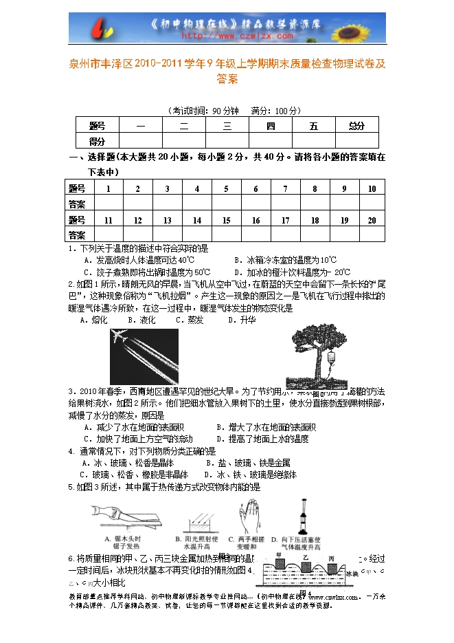 泉州市丰泽区2010-2011学年9年级上学期期末质量检查物理试卷及答案