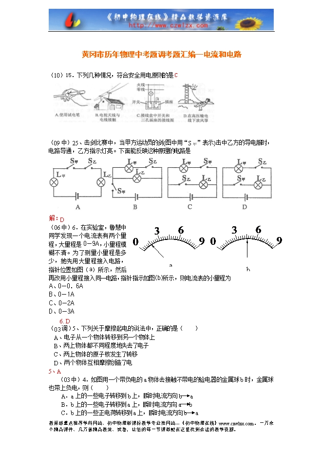 黄冈市历年物理中考题调考题汇编--电流和电路