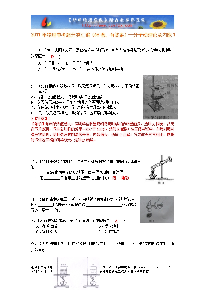 【内容简介】3.(2011沈阳)沈阳市禁止在公共场所吸烟。当有人在你身边吸烟时,你会闻到烟味,这是因为 ( D )