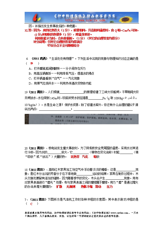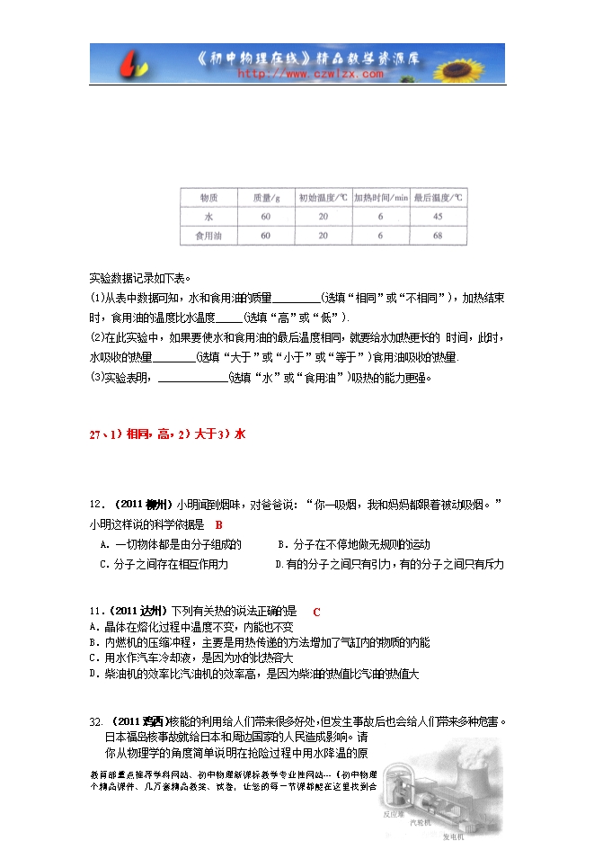 2011年物理中考题分类汇编(68套,有答案)--分子动理论和内能1